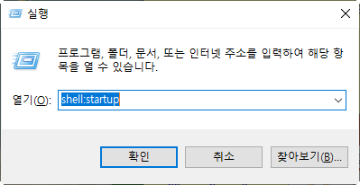 또, 이렇게 "사용한함" 만으로는 좀 찝찝해서 완전히 삭제해버리고 싶은 경우는 [Windows키] + R키 를 눌러서 나오는 "실행" 창에서 "shell:startup" 을 입력하고 [확인] 버튼을 누르면,