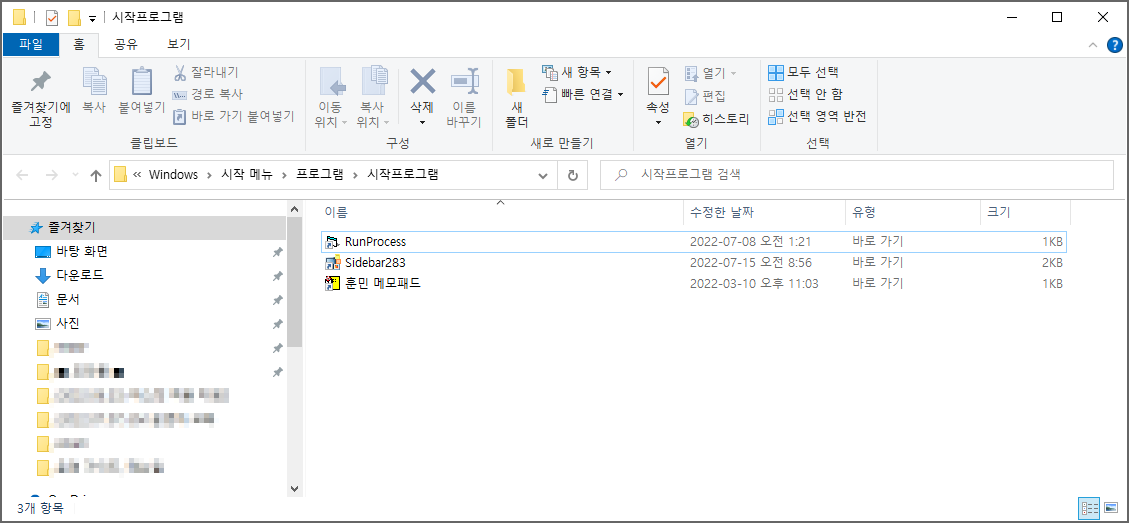 아래처럼 "시작프로그램" 폴더가 나옵니다.