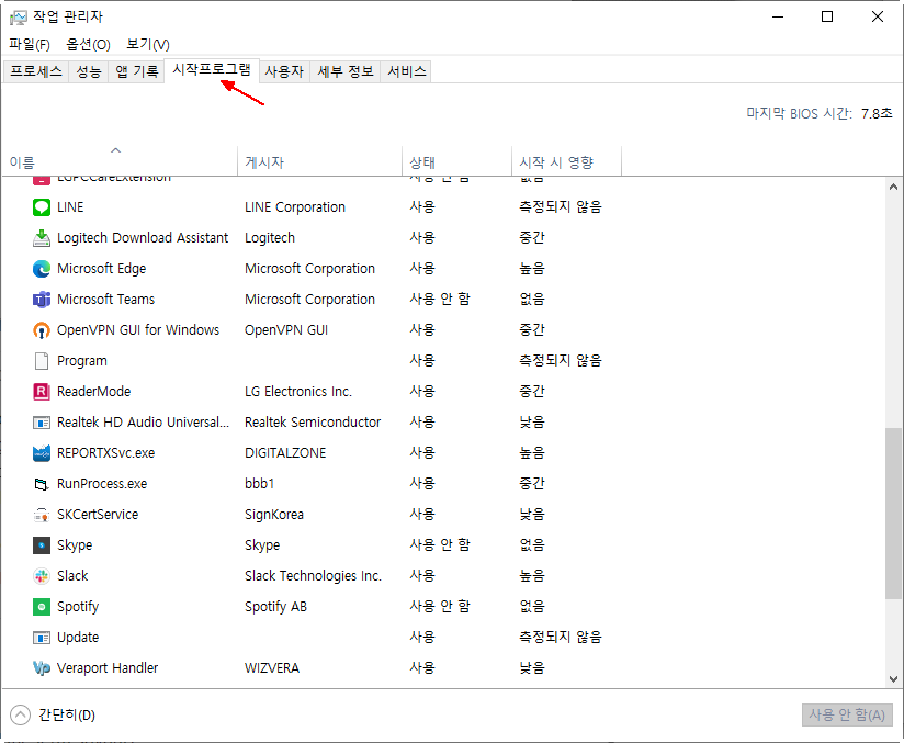 2022. 7. 21. 06:34MS Windows10 에서 시작프로그램(Startup Program)의 목록은 "작업관리자" 창의 [시작프로그램] 탭에서 쉽게 확인할 수 있습니다.