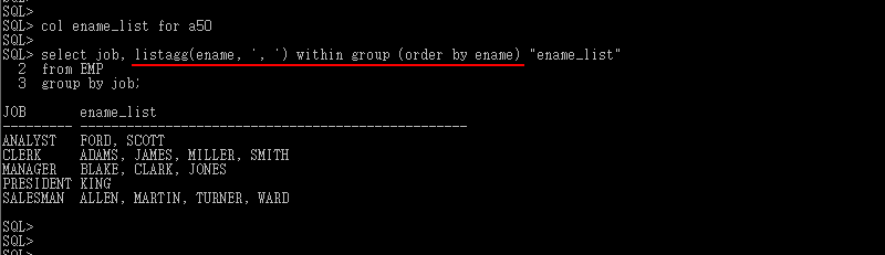 listagg() 함수는 withing group, over 등의 추가적인 구문을 더 붙여서 다양한 형태의 출력도 지원됩니다.