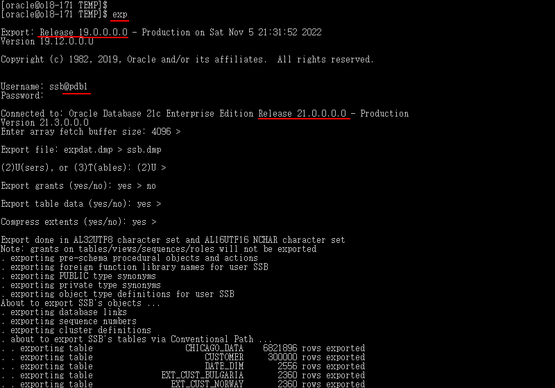 Import file: expdat.dmp > ssb.dmp