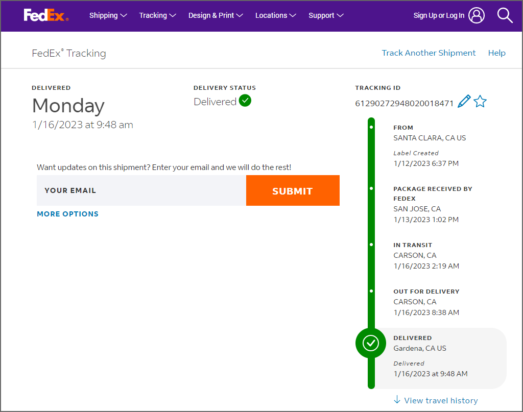 위에서 보는 것처럼 Fedex 에서는 Gardena, CA 위치에 잘 배송되었다고 나옵니다.