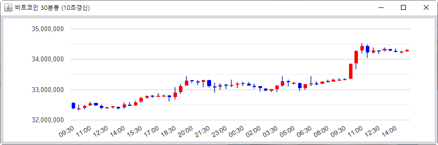 2023. 3. 17. 15:13암호화폐 비트코인(Bitcoin) 30분봉 차트를 윈도우즈 화면에 띄울 수 있는 간단한 프로그램을 만들어봤습니다.