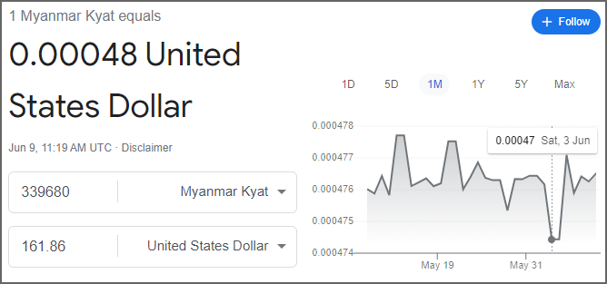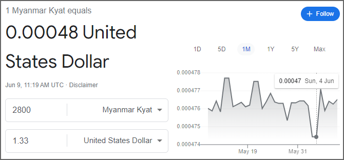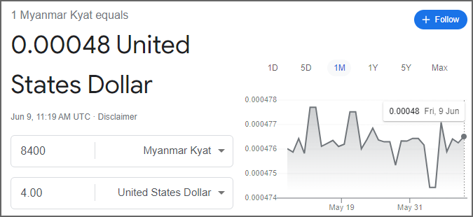 구글에서 미얀마짯 - 달러 환율을 찾아보니 8,400 짯이면 4 USD 가 되는데, 카드 청구금액도 정확히 4 USD 입니다.