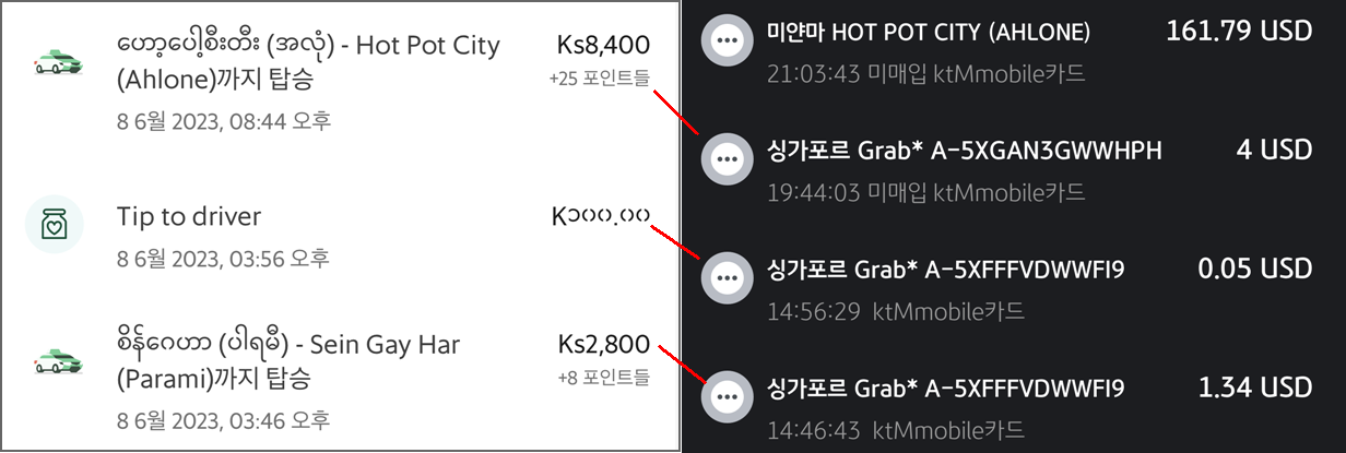 아래는 왼쪽은 그랩택시 이용한 내역이고, 오른쪽은 카드 청구내역입니다.