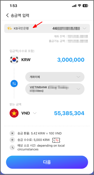 거기에서 은행계좌를 선택해서 직접 계좌에서 해외송금하는 경우는 5천달러까지 해외송금이 가능해집니다.