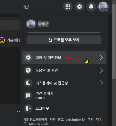 메뉴에서 [설정 및 개인정보] 를 클릭합니다.