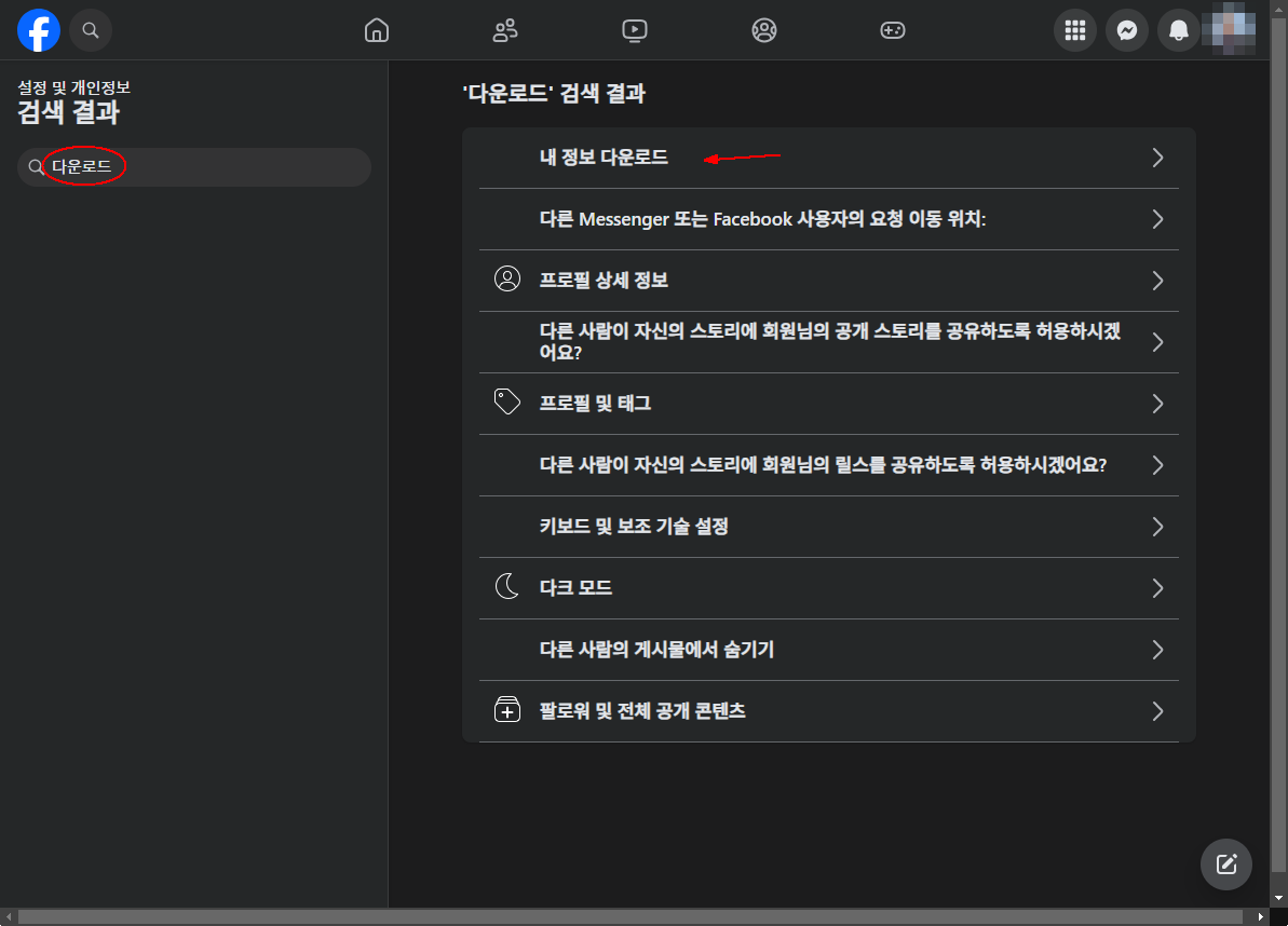 "다운로드" 검색결과에서 맨위에 있는 "내 정보 다운로드" 를 클릭합니다.
