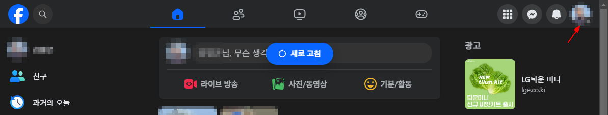 페이스북 화면 상단 맨우측에 자신의 페이스북 아이콘이 있습니다. 이것을 클릭해주면 메뉴가 나타납니다.