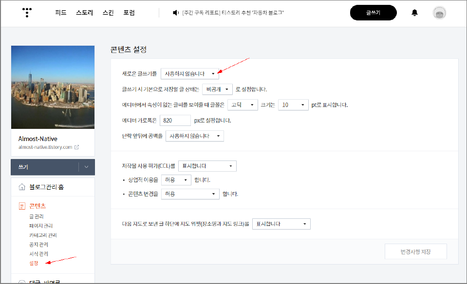 그러면, 위와같이 "콘테츠 설정" 부분에 "새로운 글쓰기를 " [ 사용하지 않습니다/사용합니다 ] 콤보박스를 볼 수 있고,